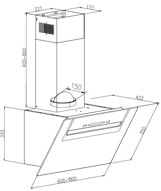 Seinään asennettava liesikupu, Viistomallinen, Sisäisellä moottorilla - Musta lasi/peililista - 600 mm - A++