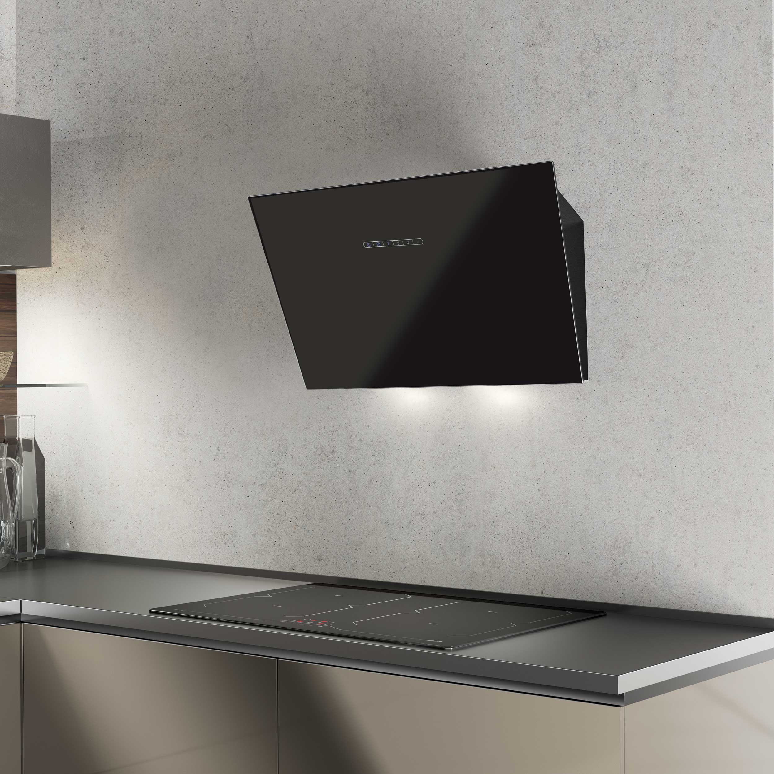 Seinään asennettava liesikupu, Viistomallinen, Sisäisellä moottorilla - Musta / musta lasi - 600 mm - A