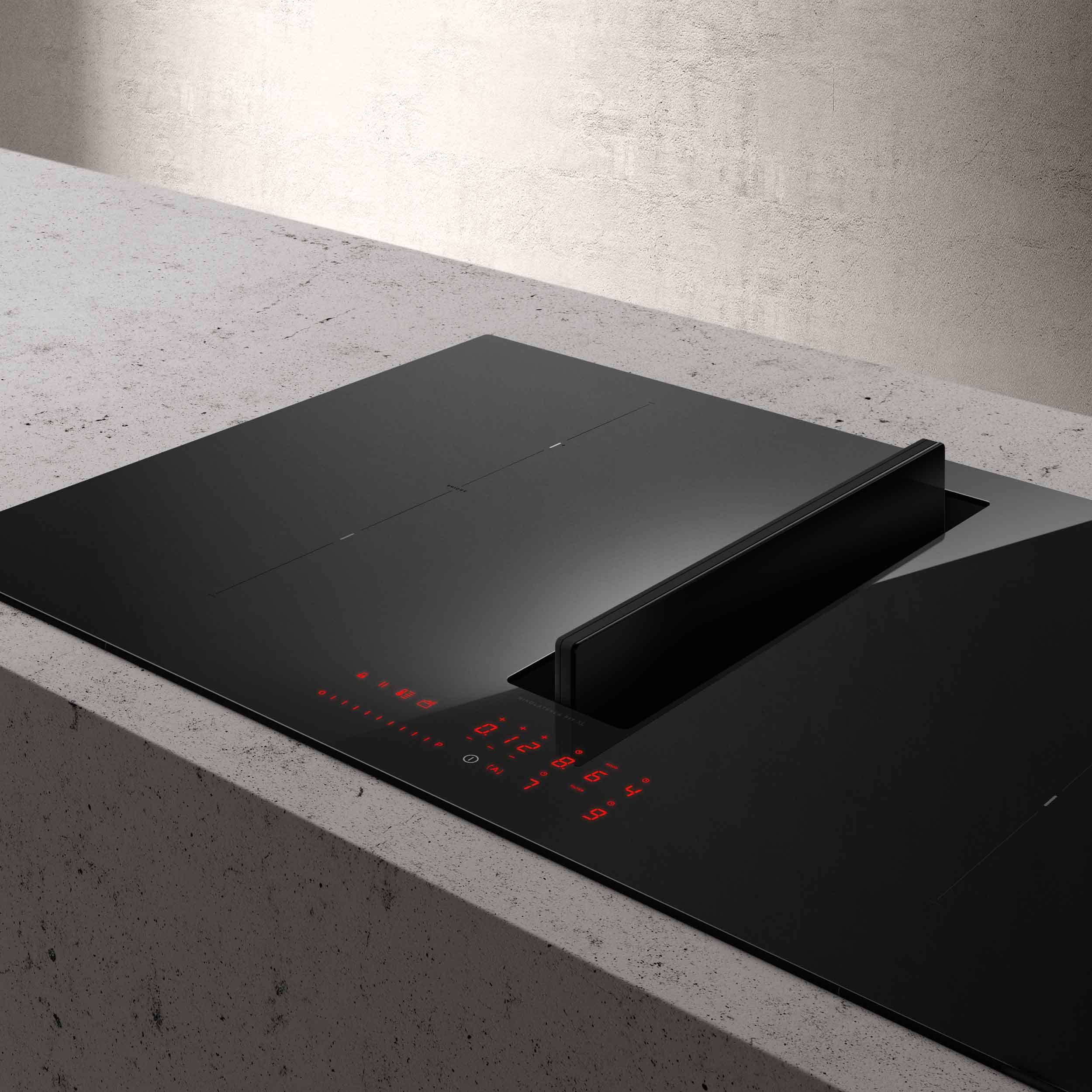 Induktiotaso liesituulettimella, Sisäisellä moottorilla. Aktiivihiilisuodatinmalli - Suora reuna, musta lasi - 830 mm