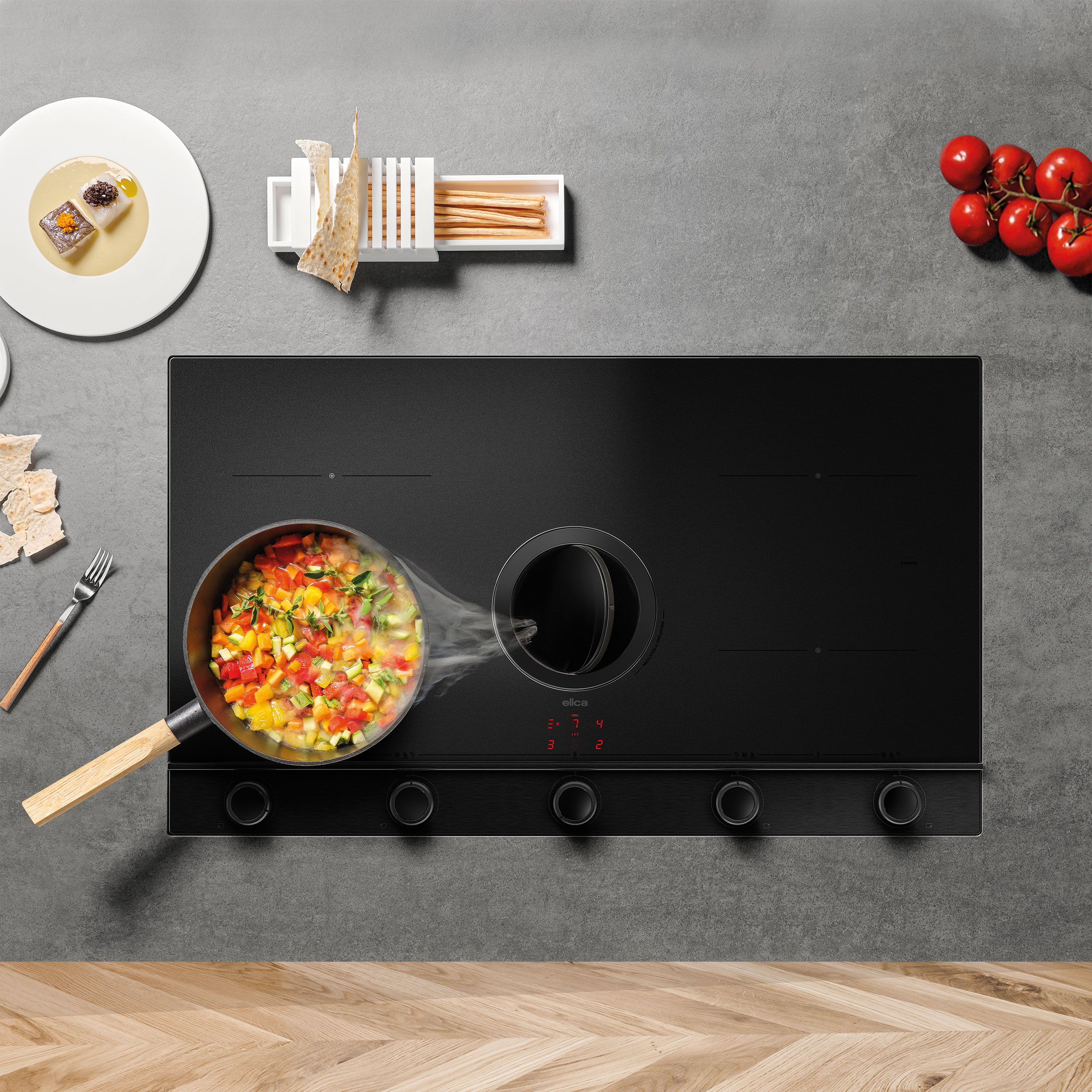 Liesitaso integroidulla liesituulettimella – RAW-lasi ja säätönupit