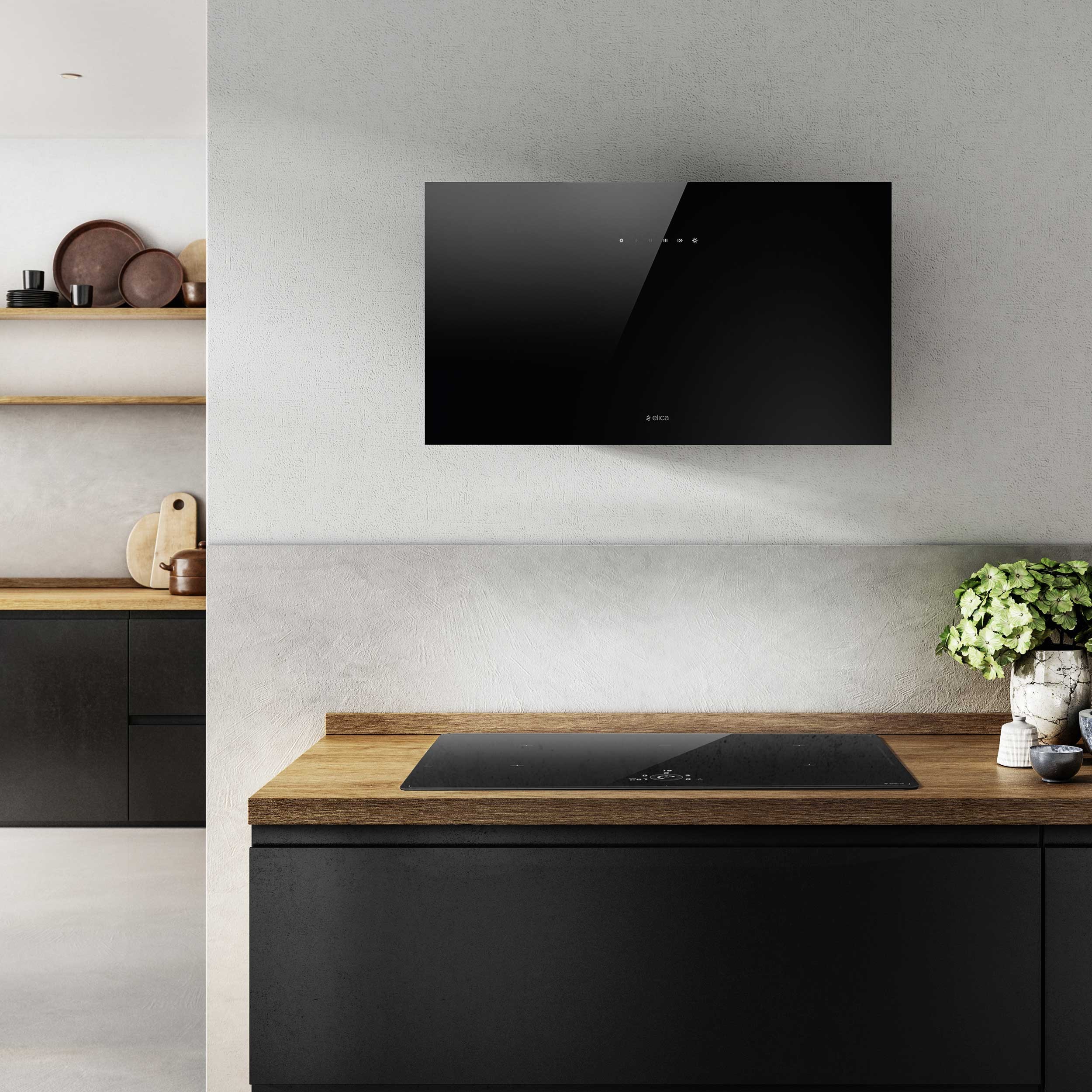 - Tyylikäs 80 cm seinäkiinnitteinen musta lasinen liesituuletin älyohjauksella ja reunaimulla.