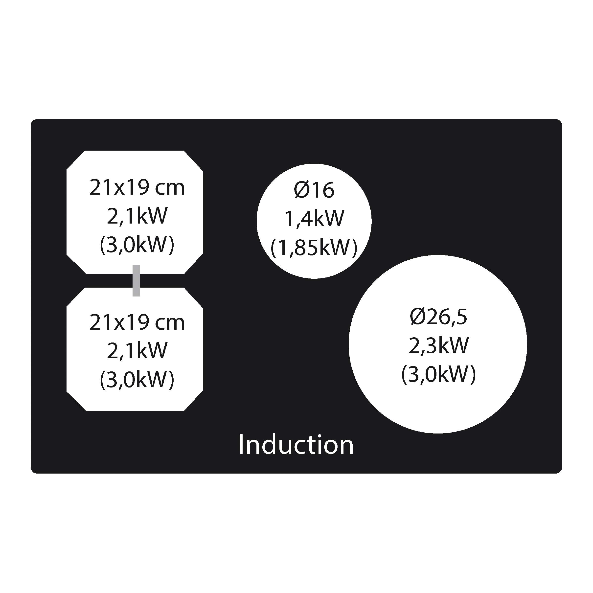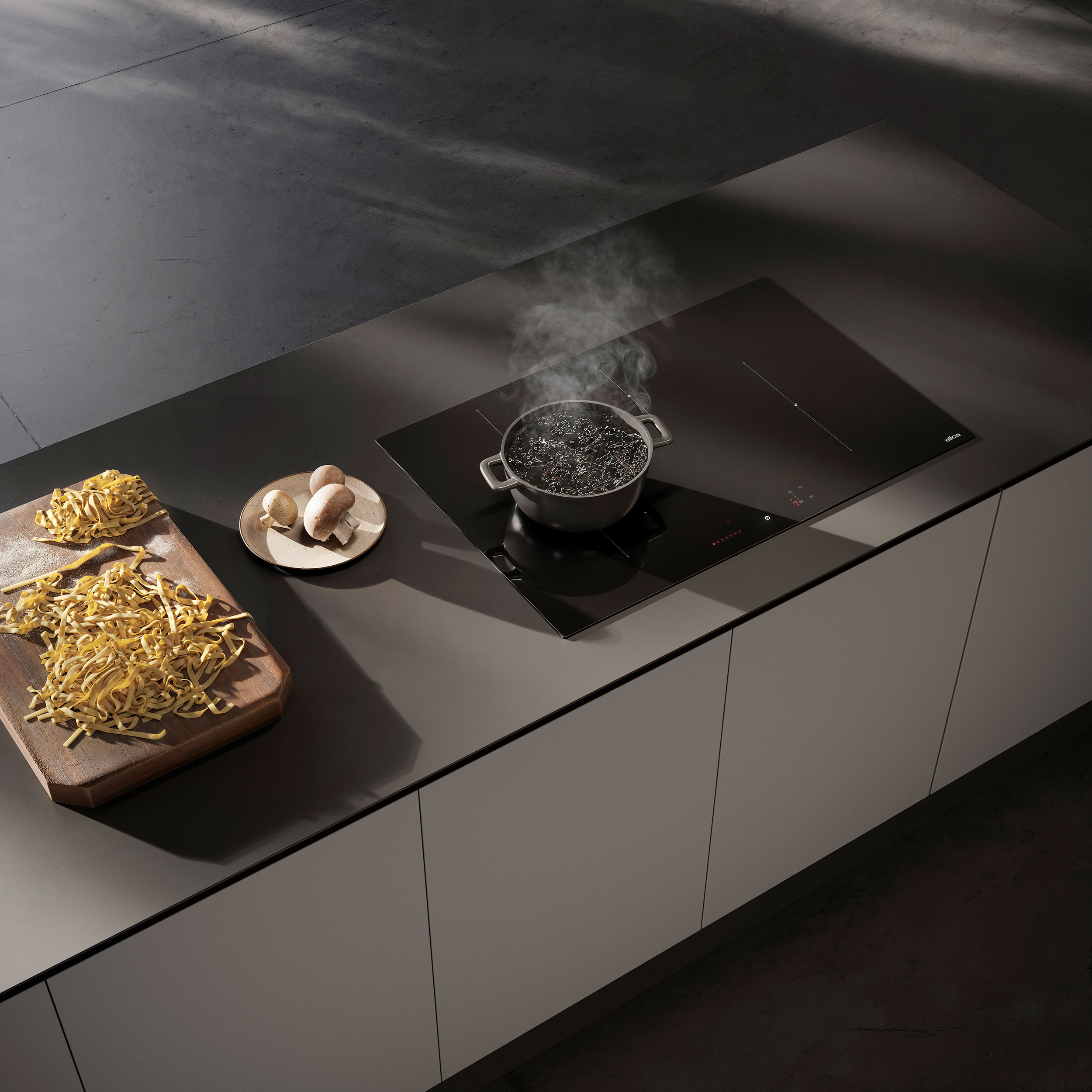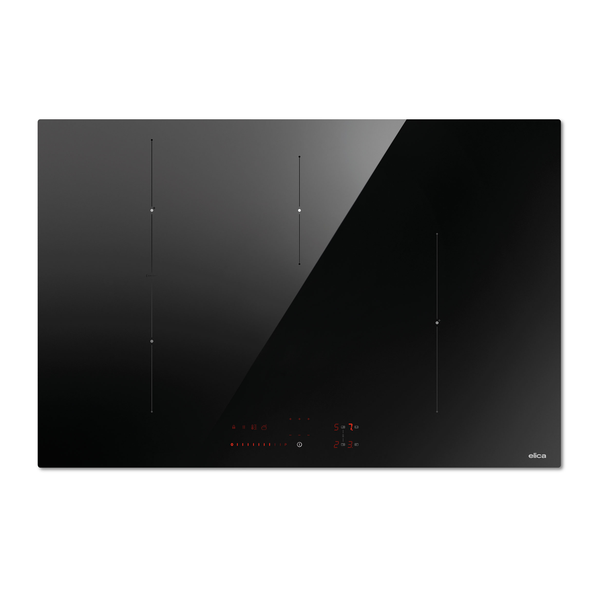 80 cm induktiotaso, jossa neljä joustavaa keittoaluetta ja silta-toiminto. Minimalistinen musta muotoilu intuitiivisilla kosketuspaneeleilla.