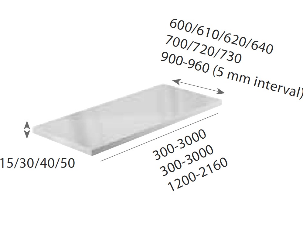Teräksinen pöytälevy 900, pöytälevy mittojen mukaan. Pöytälevy ilman allasta. Pöytälevyn pituus voidaan valita puolen senttimetrin välein. Tasainen tai nostettu reuna. Ei kuitenkaan nostettua reunaa 15 mm paksuille pöytätasoille. Pinta on sileä.