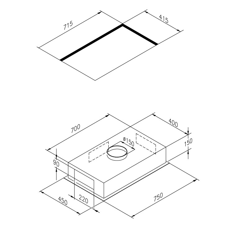 Sopii kattoon ja syvennykseen integroitavaksi, Ulkoiselle moottorille, joka ostetaan erikseen - Musta / musta lasi - Sis. kaukosäätimen - 750 mm