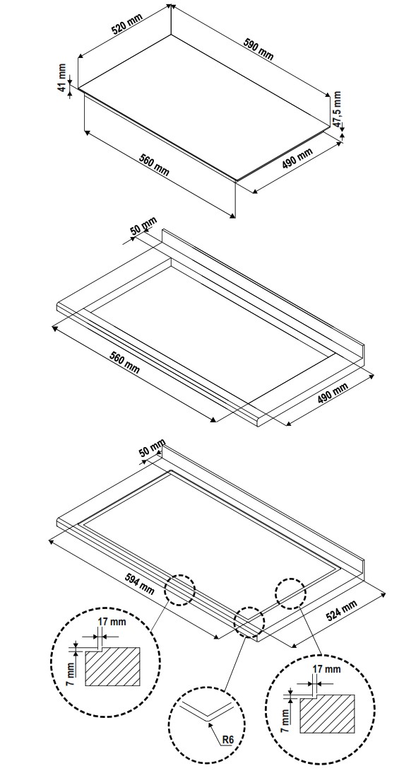- Asennusaukko (LxSxK): 560 x 490 x 41 mm