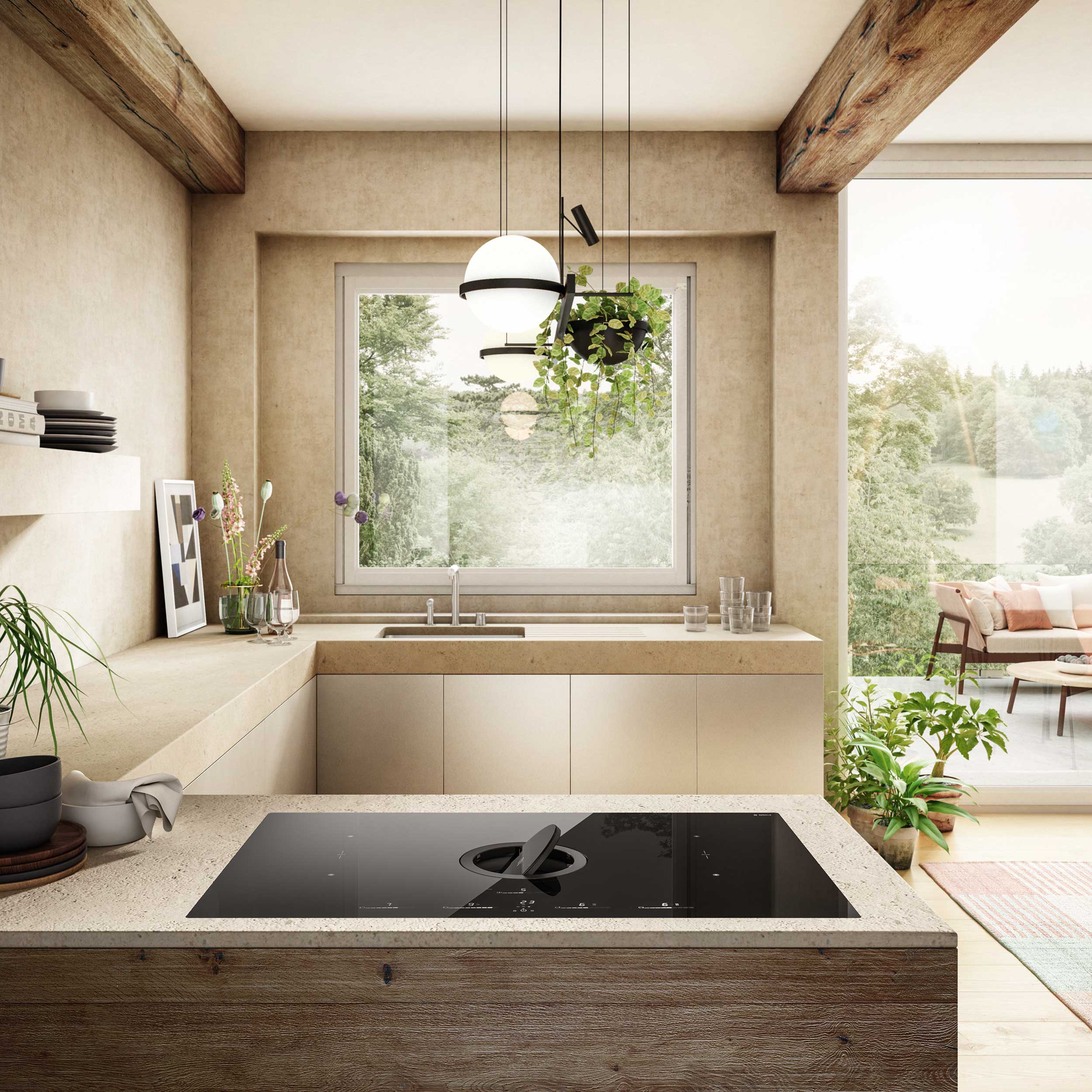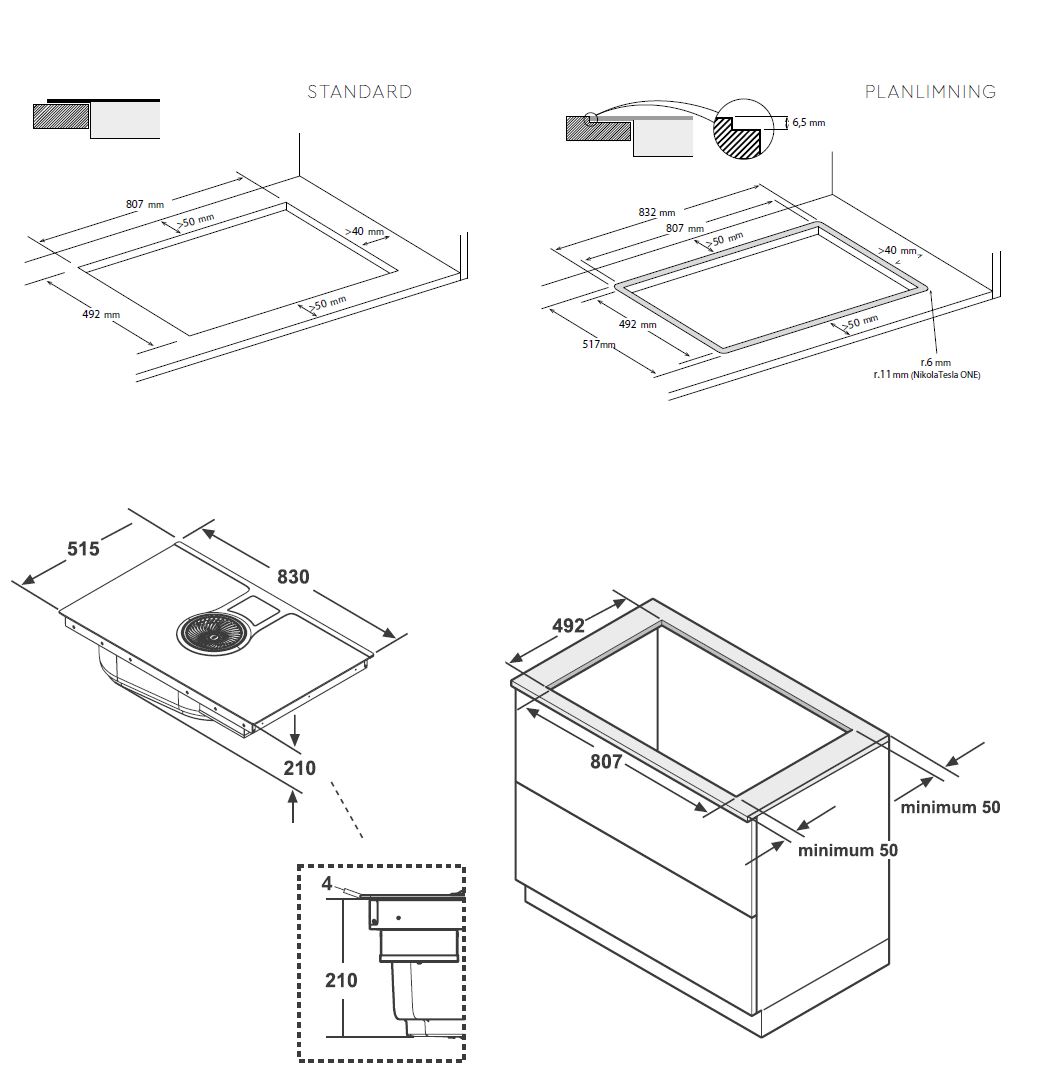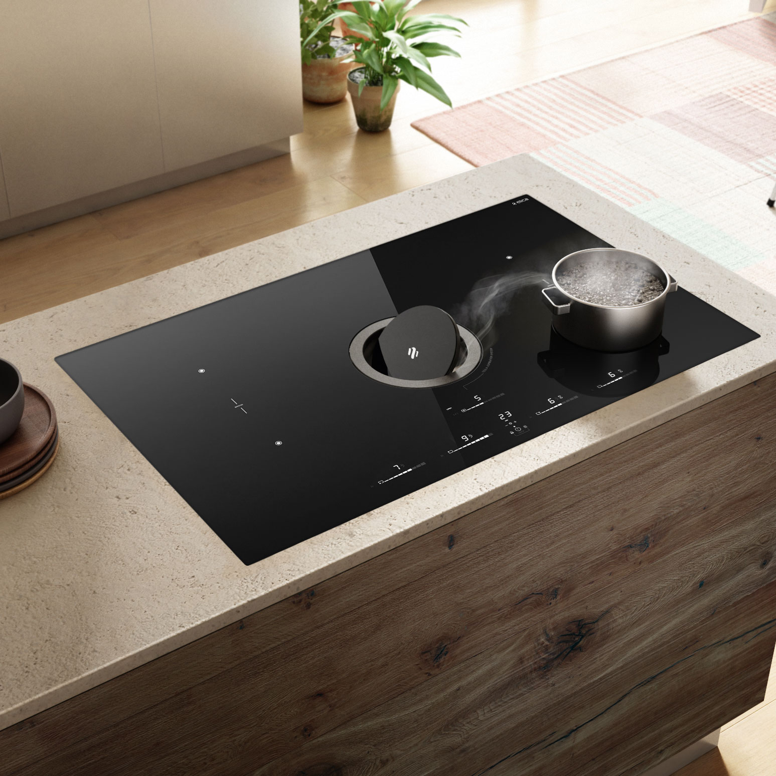 Induktiotaso liesituulettimella, Sisäisellä moottorilla. Hormiliitäntä - Suora reuna, musta lasi - 830 mm - A+
