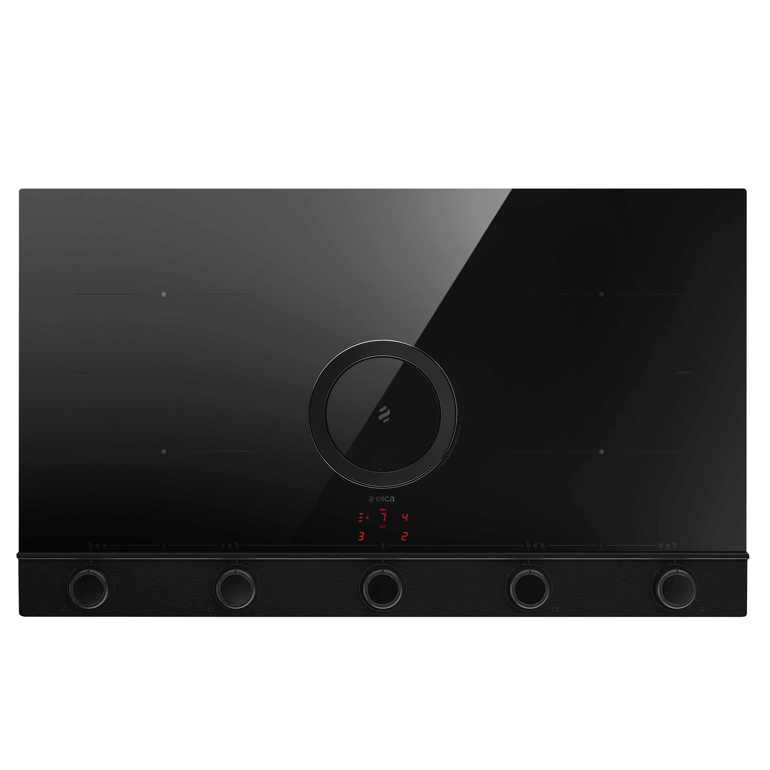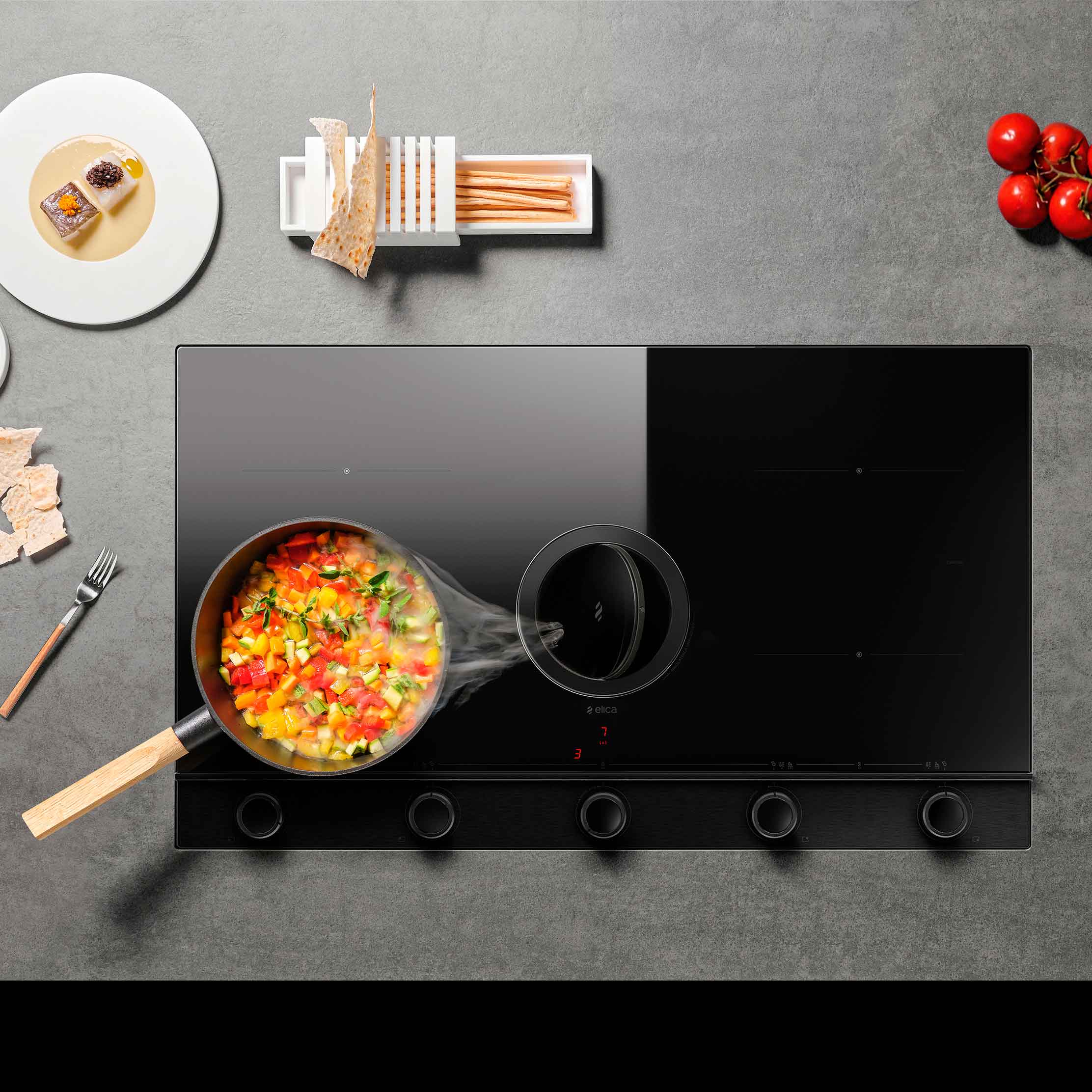Induktiotaso liesituulettimella, Sisäisellä moottorilla. Hormiliitäntä - Suora reuna, musta lasi - 900 mm - A+