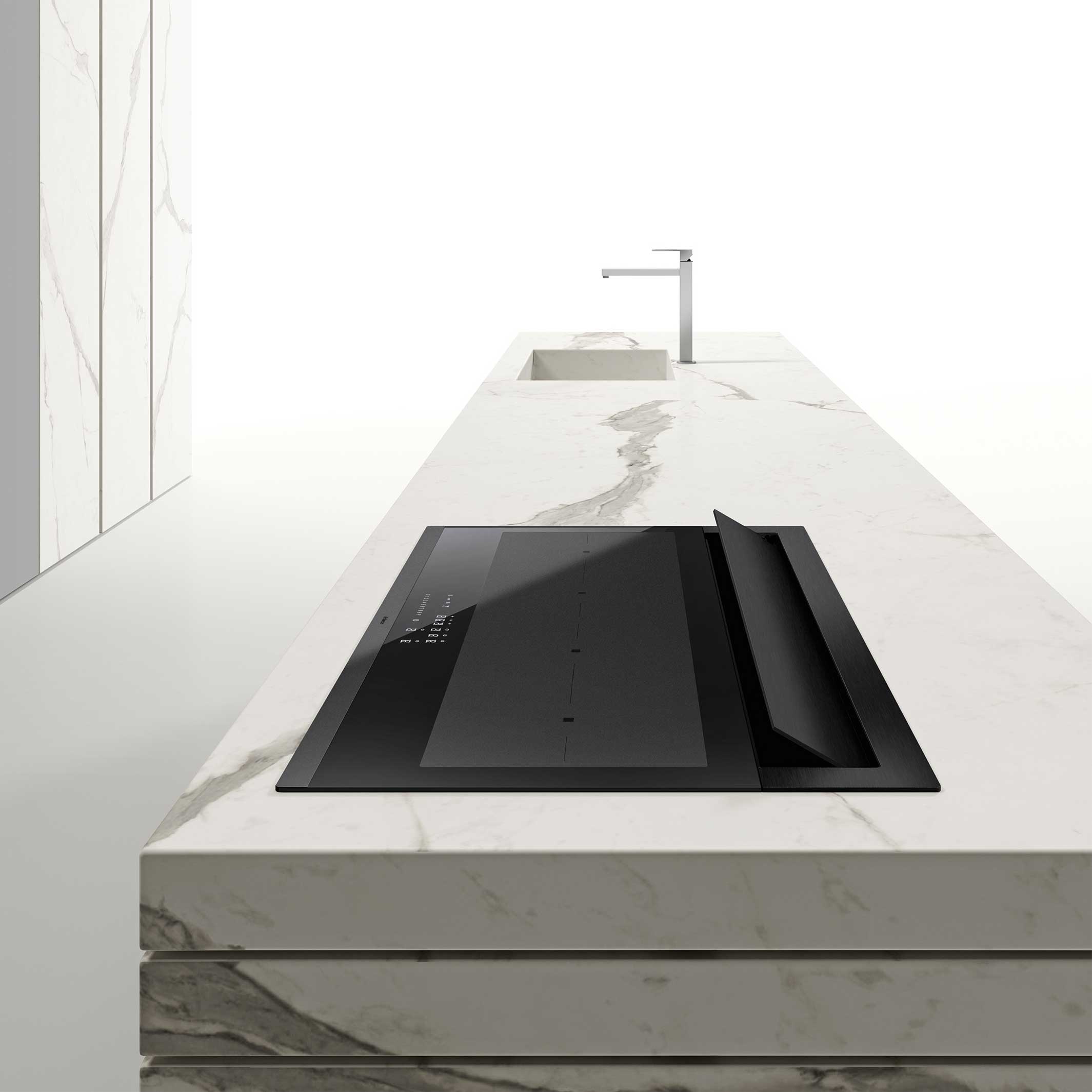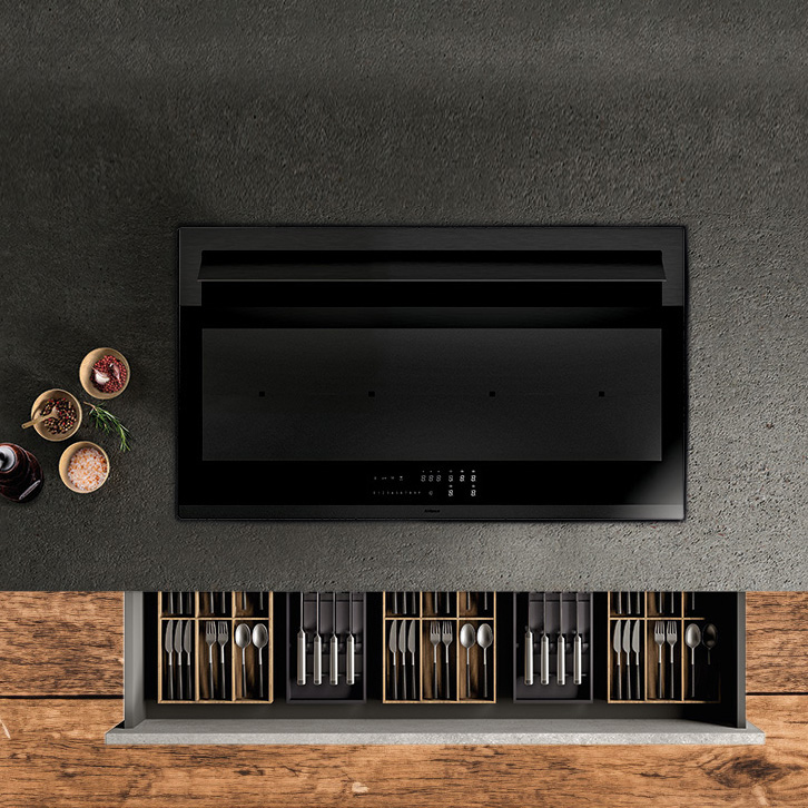 - 90 cm leveä keittotaso, jossa erityisen matala asennuskorkeus, säilyttää täyden korkeuden ylimmässä laatikossa. Pystysuuntainen moottori, 4 aluetta peräkkäin, siltaustoiminto ja hiljainen A++ käyttö.